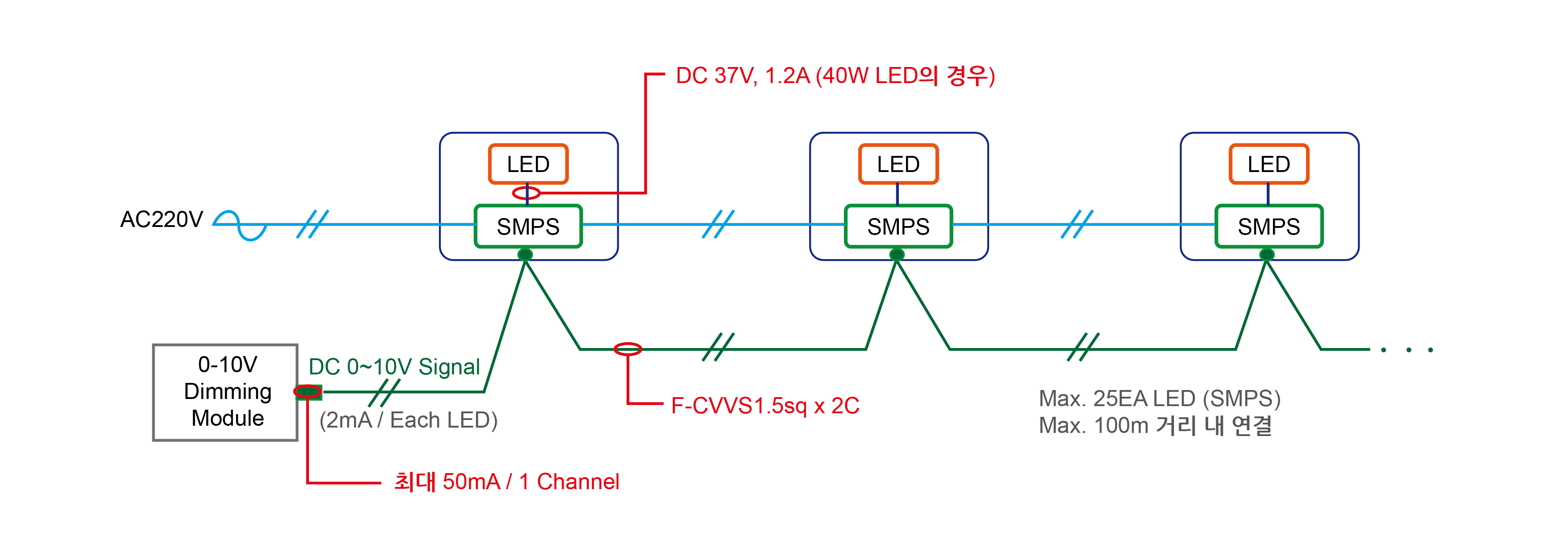 …0~10v(제로텐 방식)으로 제어선의 전압을 0V(0%)에서 10V(100%) 까지 가변시켜 LED가 디밍을 할 수있도록 제어해주는 방식이며, 외부의 제어선(0~10VDC)으로 조절하는 방식이다.