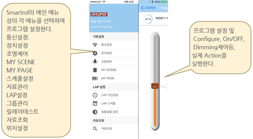 엠알의 스마트폰 앱 프로그램은 Smartrol v.3.1을 기반으로 만든 앱프로그램이다. 기존 Window 용 조명제어의 Key point 프로그램만을 발췌하여, 스마트폰 전용 앱프로그램을 만들었다.