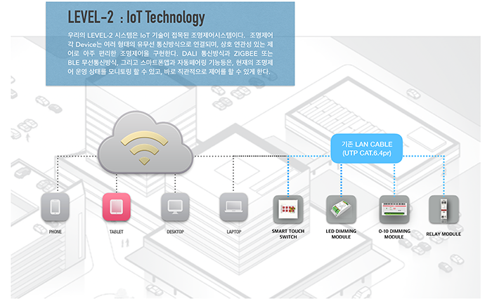 이 시스템의 명칭은 “LEVEL-2. Smart Controls ”이다. 이 시스템의 가장 큰 특징은 하드웨어 자동인식 설정기능이다. 조명제어 제품들을 설치한 후, 모든 아 이템은 자동으로 Address가 설정되고, 기본 프로그램이 자동으로 설정되어, 바로 기본적인 제어를 할 수 있게 된다. 그리고 좀더 세밀한 제어를 위해 추가 프로그램을 할 경우, 스마트터치스위치 또는 스마트폰 앱을 통해 추가 프로그램 설정이 가능하다.
