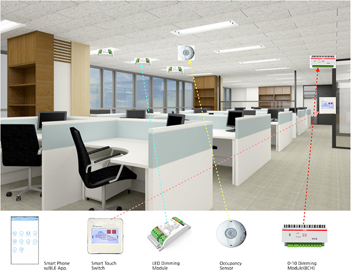 소형 사무실과 회의실에 적절한 조명제어시스템이 필요한 경우, 이 LEVEL-2. Smart Controls 조 명제어시스템이 적합하게 적용될 수 있다. 스위치와 릴레이모듈, 또는 LED 조명의 디밍을 위해서 DALI Dimming Module( LDM), Wireless Dimming Module(WDM)등을 설치하고, 전원 연결 시, 기본적인 프로그램에 의해 바로 그룹 ON/OFF제어, Scene Dimming 제어가 스위치와 스마트 폰 앱에서 운영이 된다.