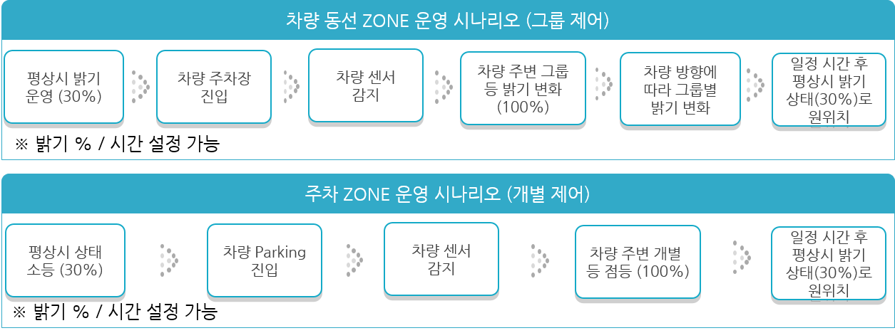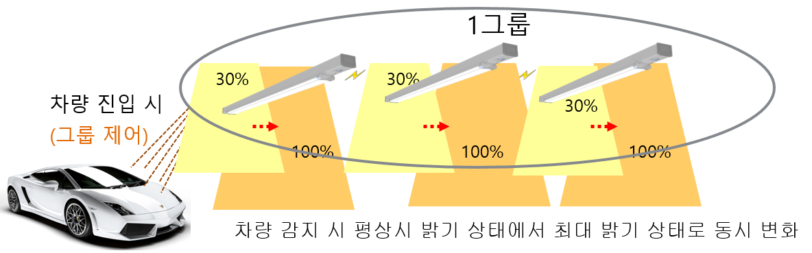 차량과 사람이 움직이는 동선에 적절한 재실감지기를 설치하고, 각 LED등기구에는 무선디밍모듈을 설치한다. 우리 무선디밍모듈에는 재실감지센서가 장착이 되어 있어서 별도의 재실감지기를 설치하지 않아도 된다. 차량이 움직이는 동선으로 미리 등기구를 점등하고, 차량이 지나가게 되면, 약간 지연된 시간을 설정하여, 소등하는 방식으로 제어 프로그램을 설정하면 간단한 시공과 시운전이 완료된다. LED등기구의 경우, 디밍제어를 쉽게 할 수 있어, 켜질 때에는 바로 100% 점등이 되고, 꺼질 때에는 시간차를 두고 서서히 밝기를 줄여주는 FADE시간 설정도 가능하다.