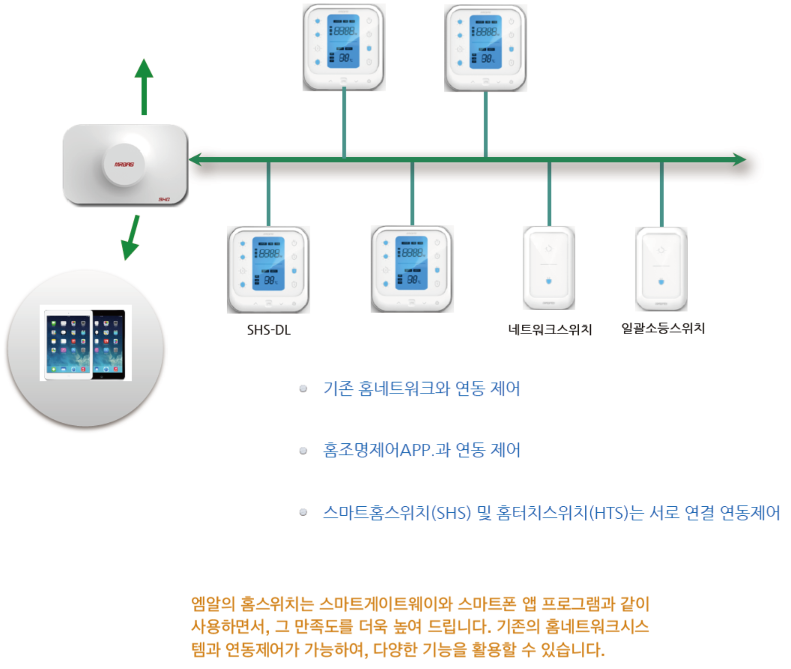 엠알의 홈제어 시스템은 홈스위치를 기본 아이템으로 구성하며, 이 홈스위치는 조명, 난방, 전영 제어를 하나의 스위치에서 실행하고자 일체형 스위치를 활용하고 홈네트워크시스템과 연동제러를 위해서 게이트웨이를 적용하며 스마트폰 앱에 의해서도 조명, 난방 및 전열 제어와 전력량 및 에너지사용량등을 모니터링 한다.