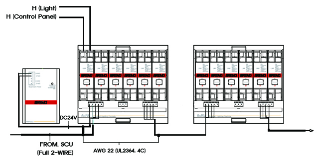 릴레이모듈은 Full 2-Wire 통신방식으로 연결되며, 각 릴레이모듈을 상하로 설치할 경우, 상하 데이터라인이 연결될 수 있도록 연결통로가 되어 있어, 데이터라인 케이블이 겉에서 볼수 없도록 처리 되어있다.