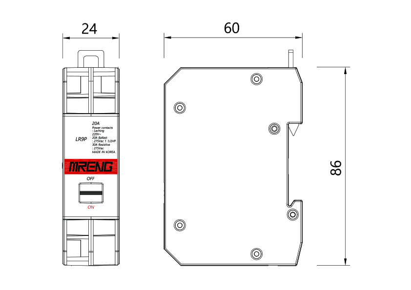 LR-9P는 반파정류 된 24VAC(맥류)를 인가하여 개폐 할 수 있으며, 텅스텐 필라멘트, 발라스트 및 저항 부하에 대해 사양에 표기된 최대 사용가능 용량까지 적용이 가능 하다 . 수동 OVERRIDE스위치를 보유하여 유사시 ON/OFF가 가능하다.