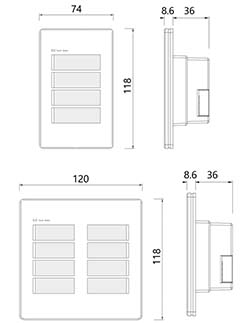 이 TS-4 스위치는 1 Gang Box에 설치가 되며, 기본적으로 4wire의 케이블로 연결된다. 그리고 기본적으로 TS-4 & -8은 4개/8개의 스위치버튼으로 구성되어 있으며, 정전형 터치방식의 버튼으로 구성되어 있다. 스위치 버튼과 버튼 부분에 상태감시 LED로 구성되어 있어, 심플하면서도 깨끗한 디자인으로 건물의 가치를 한층 향상 시킬 수 있다.