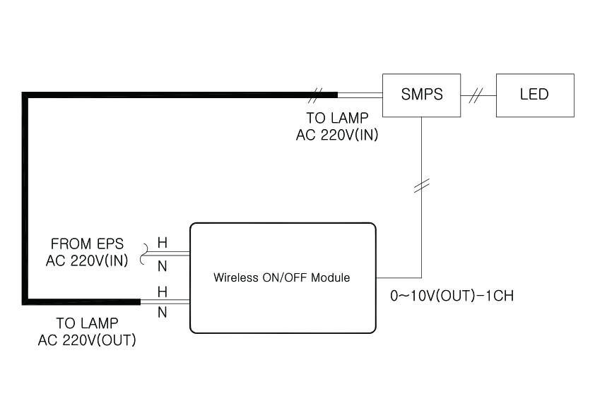Wireless ON/OFF Module은 1개의 10 Ampere Latching Relay를 포함하고, 국제표준규격 IEEE802.15.4 ZIGBEE 통신으로 구성되어 있다. 여러개의 등기구를 묶어서 한번에 무선으로 ON/OFF 시키기도 하며, 필요시 0-10VDC 신호를 보내 LED등기구에 대해 Dimming 제어도 가능하다.