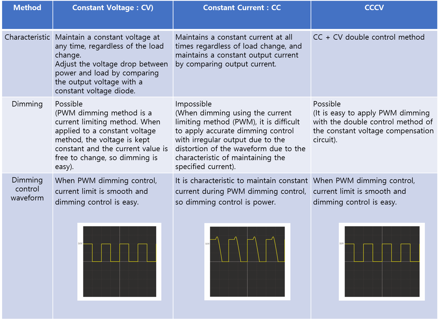 …Recently, LED lighting is installed in all buildings, and lighting dimming control is performed for efficient lighting management and energy saving. The representative dimming control method is DALI Dimming Module using the DALI protocol and wireless dimming control method are adopted. However, sometimes it is not reviewed at the design stage, and the LED luminaire equipped with a constant current type of SMPS, which is impossible to control dimming in the field, is installed. Dimming control applied in the original design drawing is not realized. To solve this problem, LED lighting equipped with SMPS of constant voltage or constant current voltage (CCCV) type capable of dimming control must be supplied. We introduce the basic LED lighting principle and dimming control data for constant voltage and constant current method.