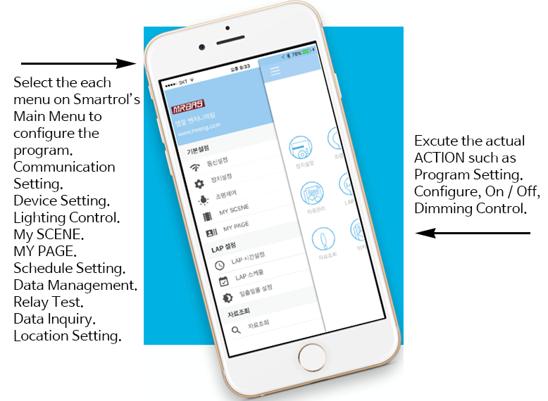 Our (MRBAS) Smart-Phone App Program is based on our Software (Smartrol v.3.1). We have created the Smart-Phone specific App Program by extracting the Key Points from our Lighting Control Software (Smartrol v.3.1). We have covered the essential functions of our ELC Lighting Control System to our Smart-Phone App Program. Especially, this App Program has various functions such as Schedule Program, MY PAGE, MY SCENE setting and programmed contents downloading to replace the software of Monitoring PC.
