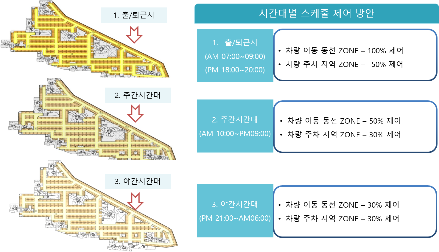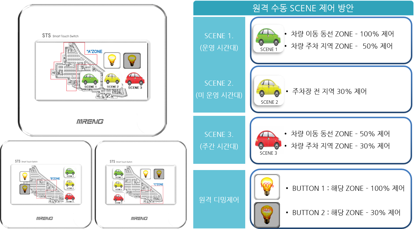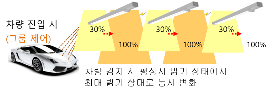 차량과 사람이 움직이는 동선에 적절한 재실감지기를 설치하고, 각 LED등기구에는 무선디밍모듈을 설치한다. 우리 무선디밍모듈에는 재실감지센서가 장착이 되어 있어서 별도의 재실감지기를 설치하지 않아도 된다. 차량이 움직이는 동선으로 미리 등기구를 점등하고, 차량이 지나가게 되면, 약간 지연된 시간을 설정하여, 소등하는 방식으로 제어 프로그램을 설정하면 간단한 시공과 시운전이 완료된다. LED등기구의 경우, 디밍제어를 쉽게 할 수 있어, 켜질 때에는 바로 100% 점등이 되고, 꺼질 때에는 시간차를 두고 서서히 밝기를 줄여주는 FADE시간 설정도 가능하다.