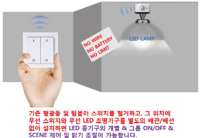 이 무선스위치와 무선디밍모듈을 사용할 경우, 기존 빌딩의 사무실이나 회의실의 조명제어장치가 쉽고 간단하게 설치가 된다.기존 형광등 및 텀블러스위치를 철거하고, 그 위치에 무선스위치와 무선 ELD조명기구를 별도의 배관/배선공사 없이 설치하면, LED등기구의 개별 및 그룹 ON/OFF, SCENE제어와 밝기 조절 제어가 가능하다.