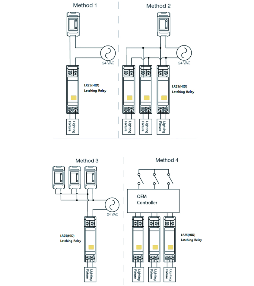 LR25(HID)-AC24V 릴레이는 플러그인 타입으로 장착 될 수 있는 래칭 타입의 릴레이다. 메인접점 및 상태를 표시하는 보조 접점 을 가지고 있으며 피드백 상태를 표시한다. 이 릴레이는 24VAC를 인가하여 개폐 할 수 있으며, 텅스텐 필라멘트, 발라스트 및 저항 부하에 대해 사양에 표기된 최대 사용가능 용량까지 적용이 가능 하다 . 수동 OVERRIDE스위치를 보유하여 유사시 ON/OFF가 가능하다.
