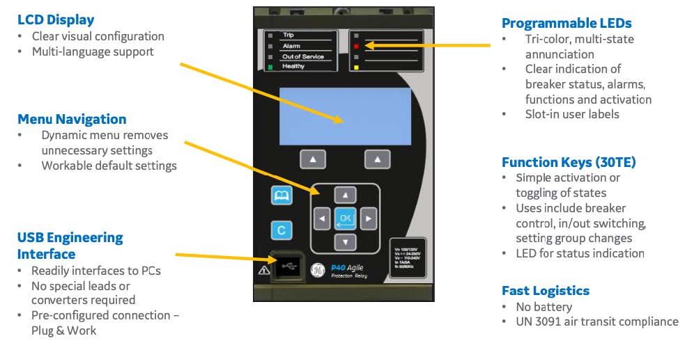 P40 Agile Enhanced는 64개 샘플/사이클의 샘플링과 데이터로깅, 오실 로그래프 및 이벤트 내용을 모니토링하고, 특히 차단기의 다양한 이벤트 내 용(동작시간, 횟수, 아크 내용등을 저장 감시한다. 다양한 옵션기능으로 다양한 Application이 가능하다. 즉, IEC61850 Edition 1과 2 통신프로토콜을 적용하여, 타기종과 호환도 수월하다. 또한 계전기의 Depth가 160mm로 수배전반 공간활용에도 유리하다.