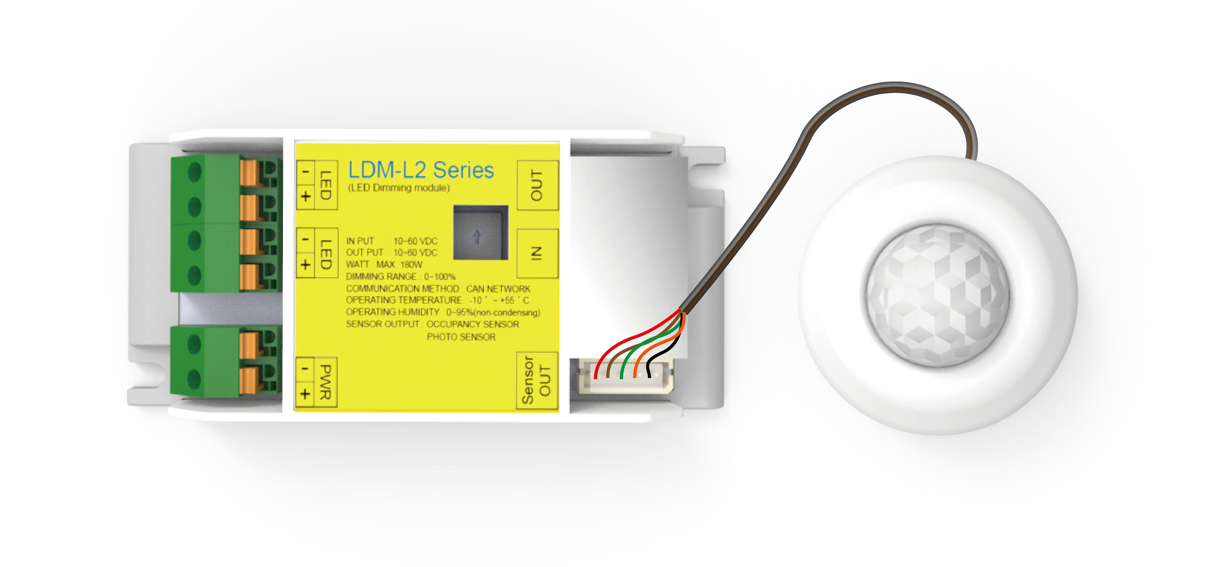 이 Occupancy Sensor는 LDM II-L2에 연결되어, LDM 뿐만 아니라, 다른 제어모듈도 연동제어 한다. 센서 감지범위는 반경 5M이내 이다. 센서의 지연시간과 Enable 및 Disable은 선택은 설정 장비인 STS에서 설정한다.