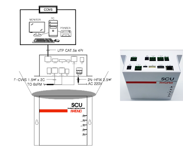 SCU는 PC와 조명제어반 간의 데이타 통신을 하는 장치이다. 각 조명제어반들, 스위치, 센서, DALI Master 등의 DATA BASE를 설정하고, 각 프로그램을 작성하여 전송하는 작업등을 이 SCU를 거쳐 실행한다.