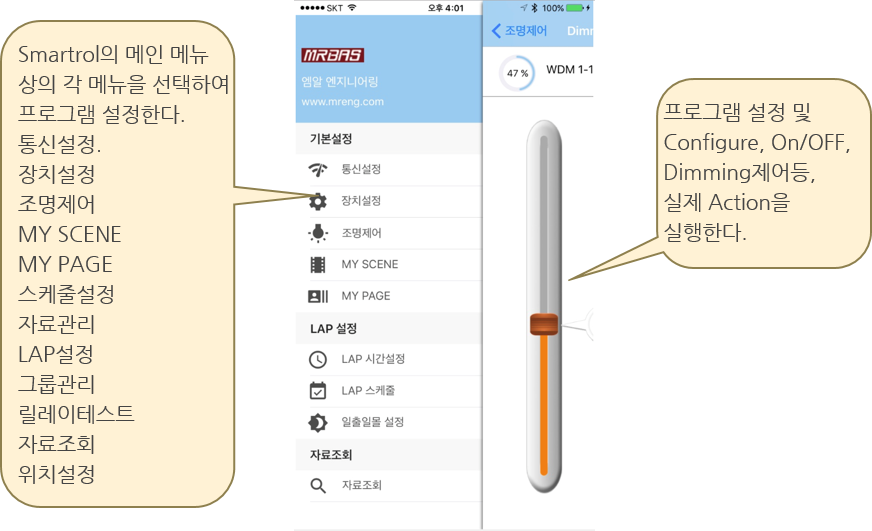 Our (MRBAS) Smart-Phone App Program is based on our Software (Smartrol v.3.1). We have created the Smart-Phone specific App Program by extracting the Key Points from our Lighting Control Software (Smartrol v.3.1). We have covered the essential functions of our ELC Lighting Control System to our Smart-Phone App Program. Especially, this App Program has various functions such as Schedule Program, MY PAGE, MY SCENE setting and programmed contents downloading to replace the software of Monitoring PC.