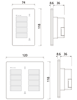 d&s TS 스위치는 Dimming 및 Scene을 조작하는 스위치이다. 1번부터 4번까지 d&s TS-4와 1번부터 8번까지 d&s TS-8의 버튼은 사전 설정된 Scene 스위치로 사용되기도 하고, 수동 개별 디밍스위치로 사용되기로 한다.